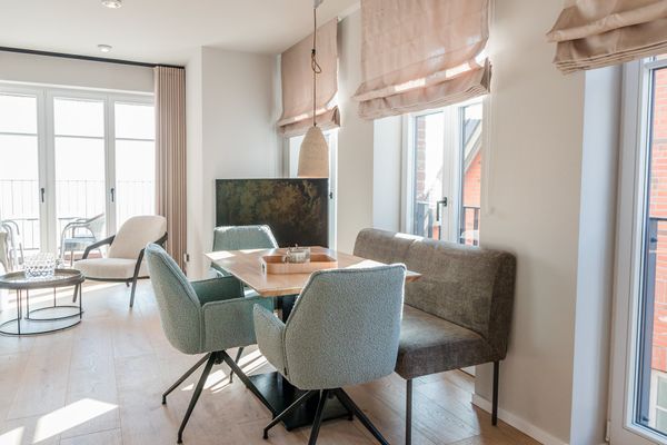 Die hochwertig eingerichtete Wohnung ist vollständig im 1. Obergeschoss gelegen und über einen Aufzug zu erreichen. Sie unterteilt sich in einen großzügigen Wohn- und Essbereich mit offener Küche, zwei Schlafzimmer - davon eines mit Bad en Suite -, ein zweites Duschbad und einen Hauswirtschaftsraum mit Waschmaschine. Die Schlafzimmer sind jeweils mit einem Doppelbett und einem Smart-TV ausgestattet. Über den Wohnbereich gelangen Sie auf die südöstlich ausgerichtete Dachterrasse.