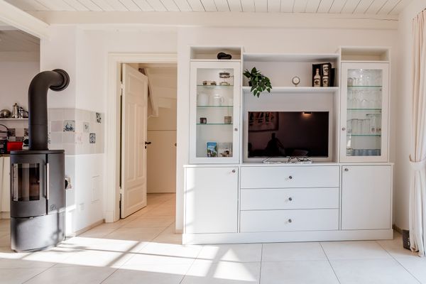 Im Erdgeschoss befinden sich der großzügige Wohn- und Essbereich mit offener Küche, eine separate Speisekammer, ein Duschbad und der Hauswirtschaftsraum sowie ein geräumiger Flur. Über den Wohnbereich gelangen Sie direkt auf die Südterrasse und in den Garten. Der dänische Eisenofen im Wohnbereich sorgt auch an kühleren Tagen für eine angenehme Atmosphäre.